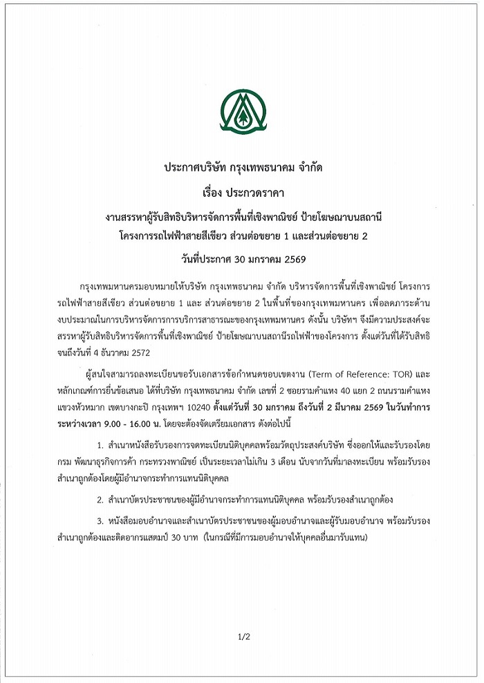 ประกวดราคา งานสรรหาผู้รับสิทธิบริหารจัดการพื้นที่เชิงพาณิชย์ ป้ายโฆษณาบนสถานี